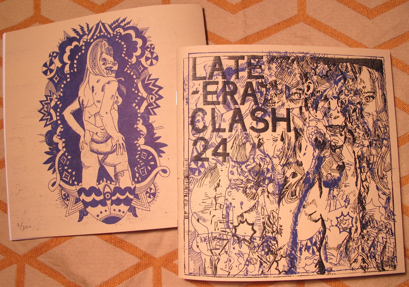 Risograph printed (blue), two color cardstock covers, 28 pages of content, rad centerfold...